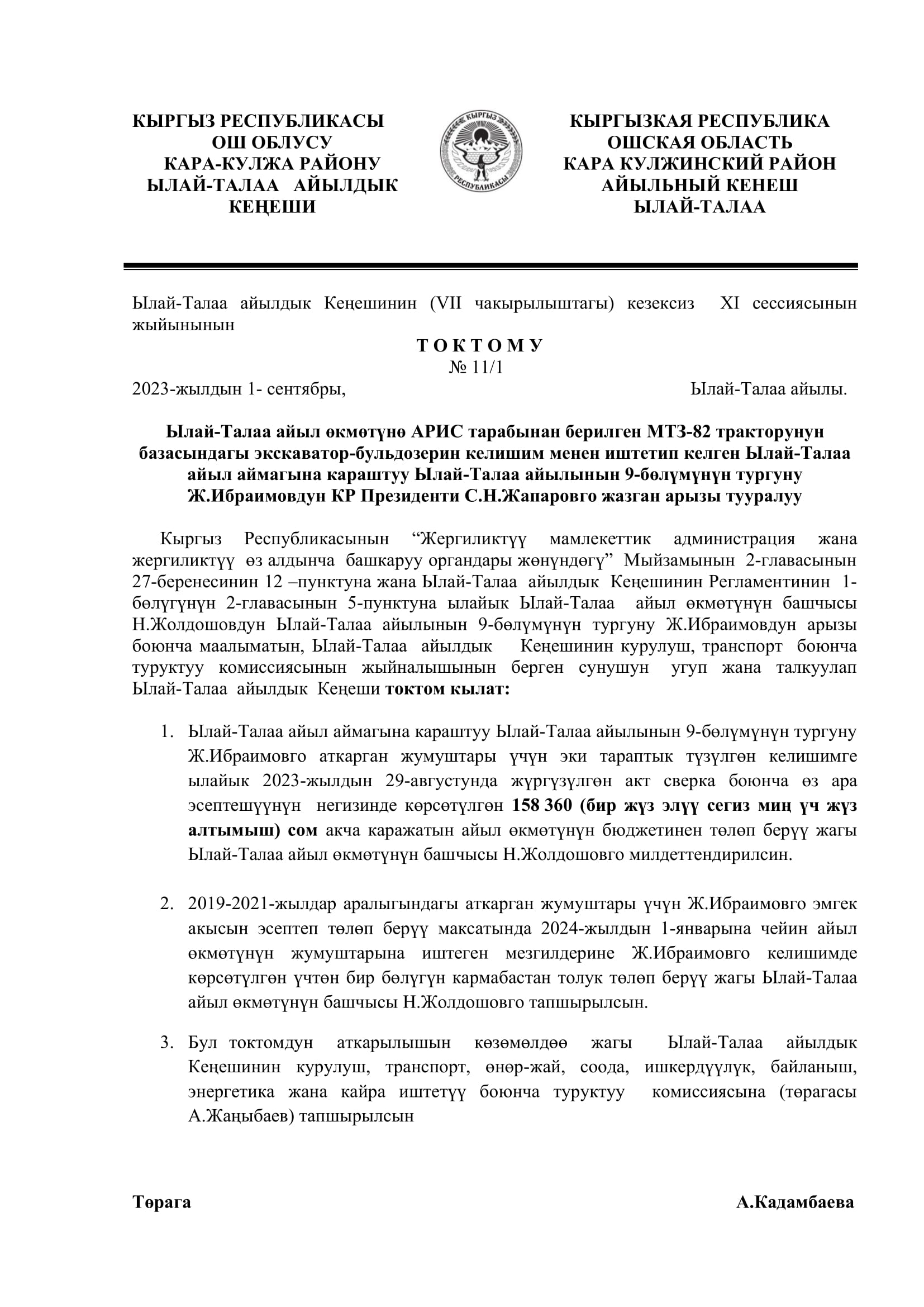 2023-жылдын 1-сентябрында кабыл алынган токтом