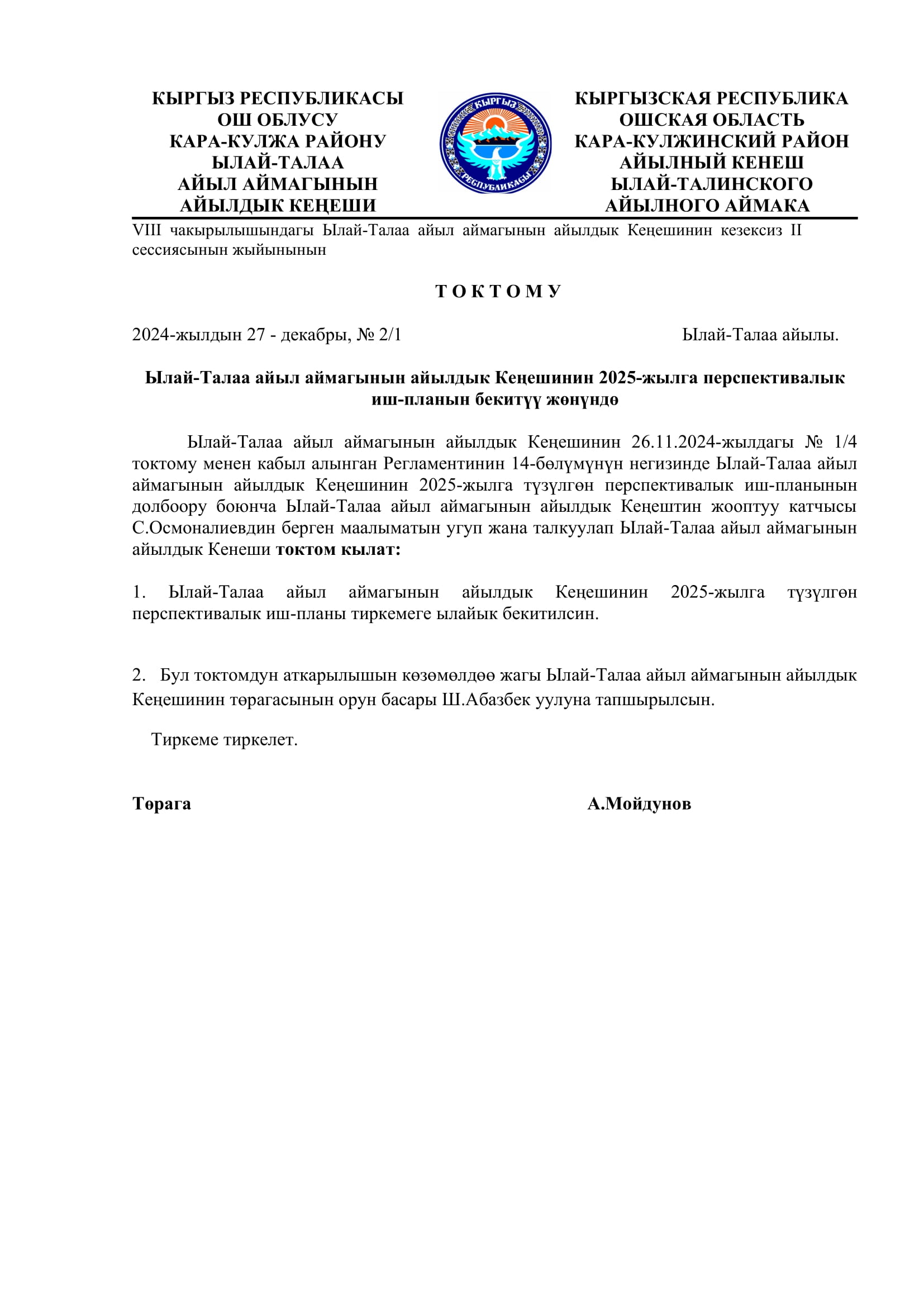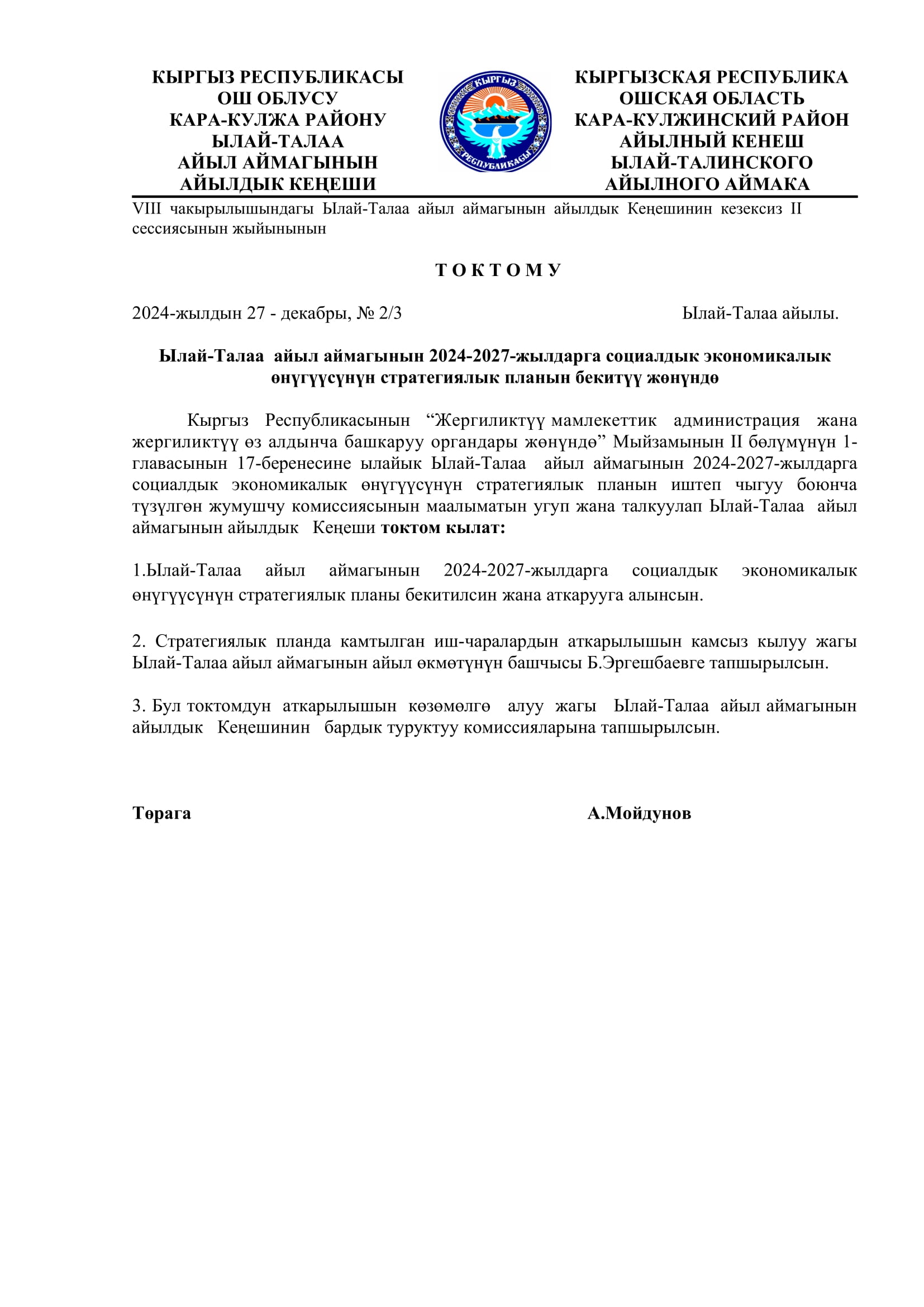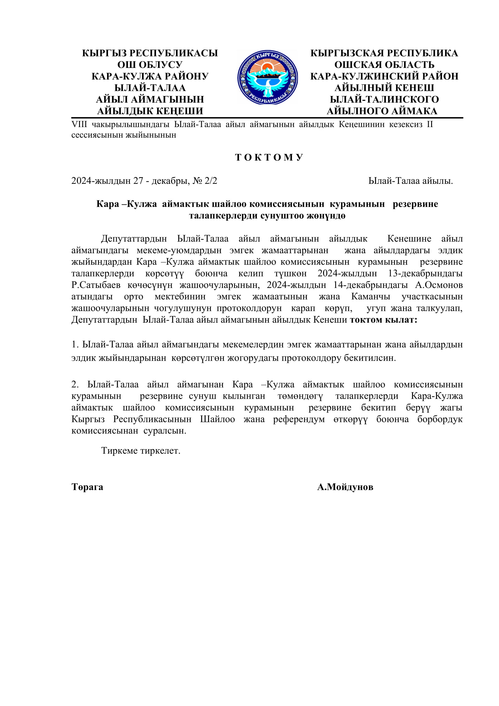 2024-жылдын 27-декабрында кабыл алынган токтомдор