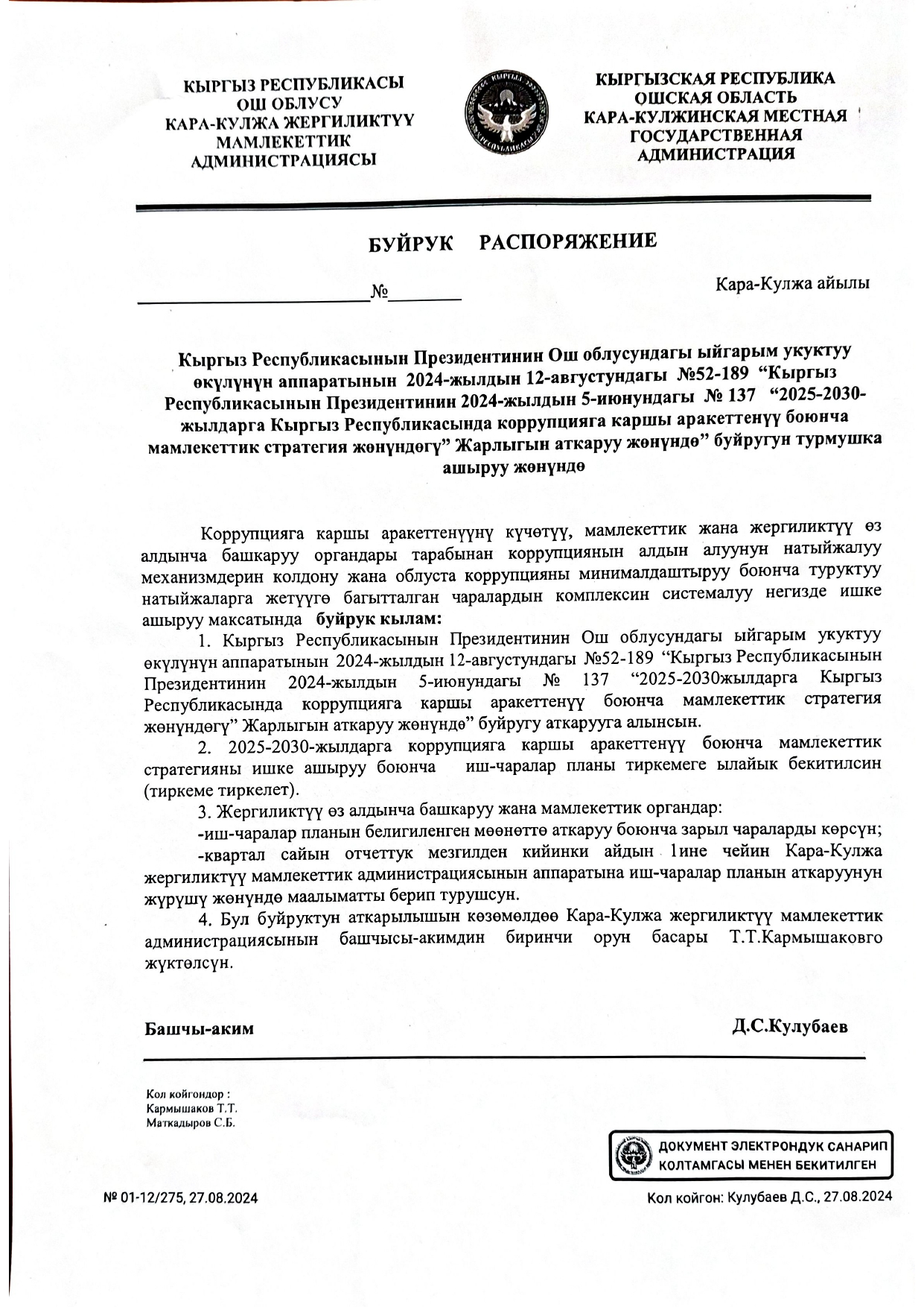 Кыргыз Республикасынын Президентинин № 137 жарлыгын аткаруу.